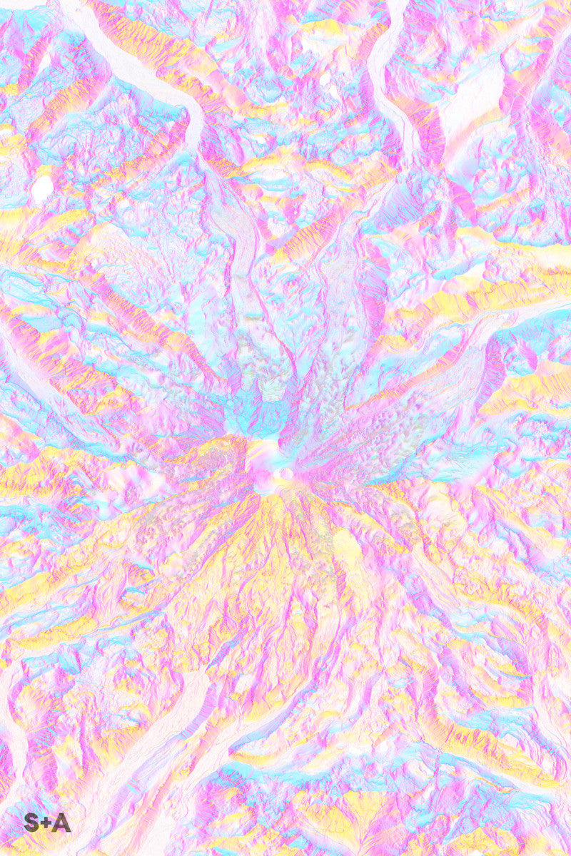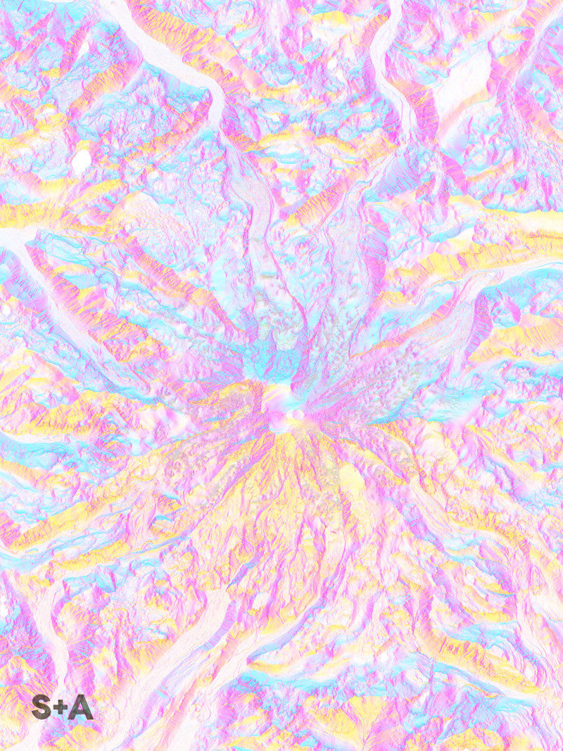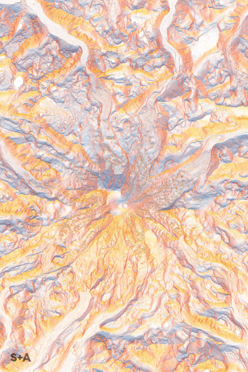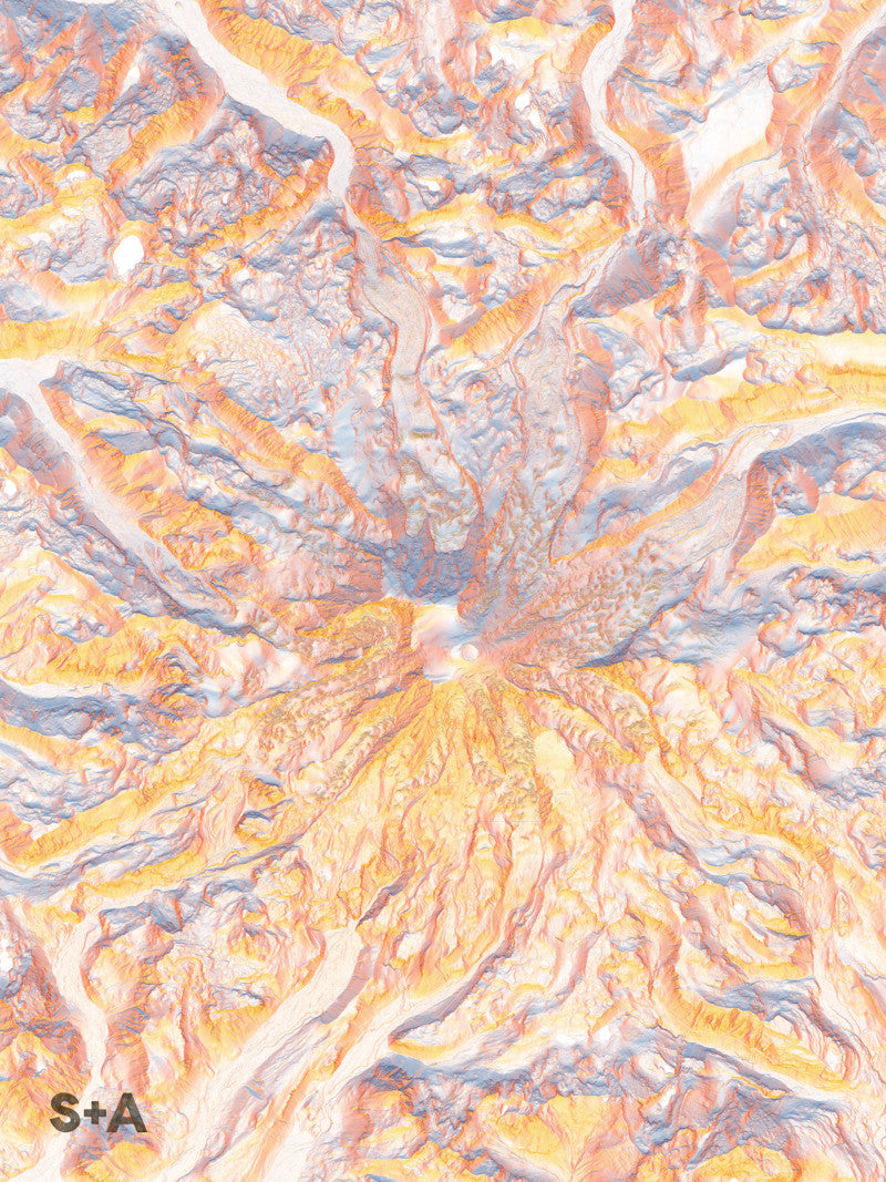The high resolution data used in this map series allows you to see the folding and shifting ice in the many glaciers that flow down from Mt. Rainier, the highest mountain in the Cascade mountain range and the state of Washington. The Columbia Crest is Mt. Rainier's highest peak at an elevation of 14,411 ft.
